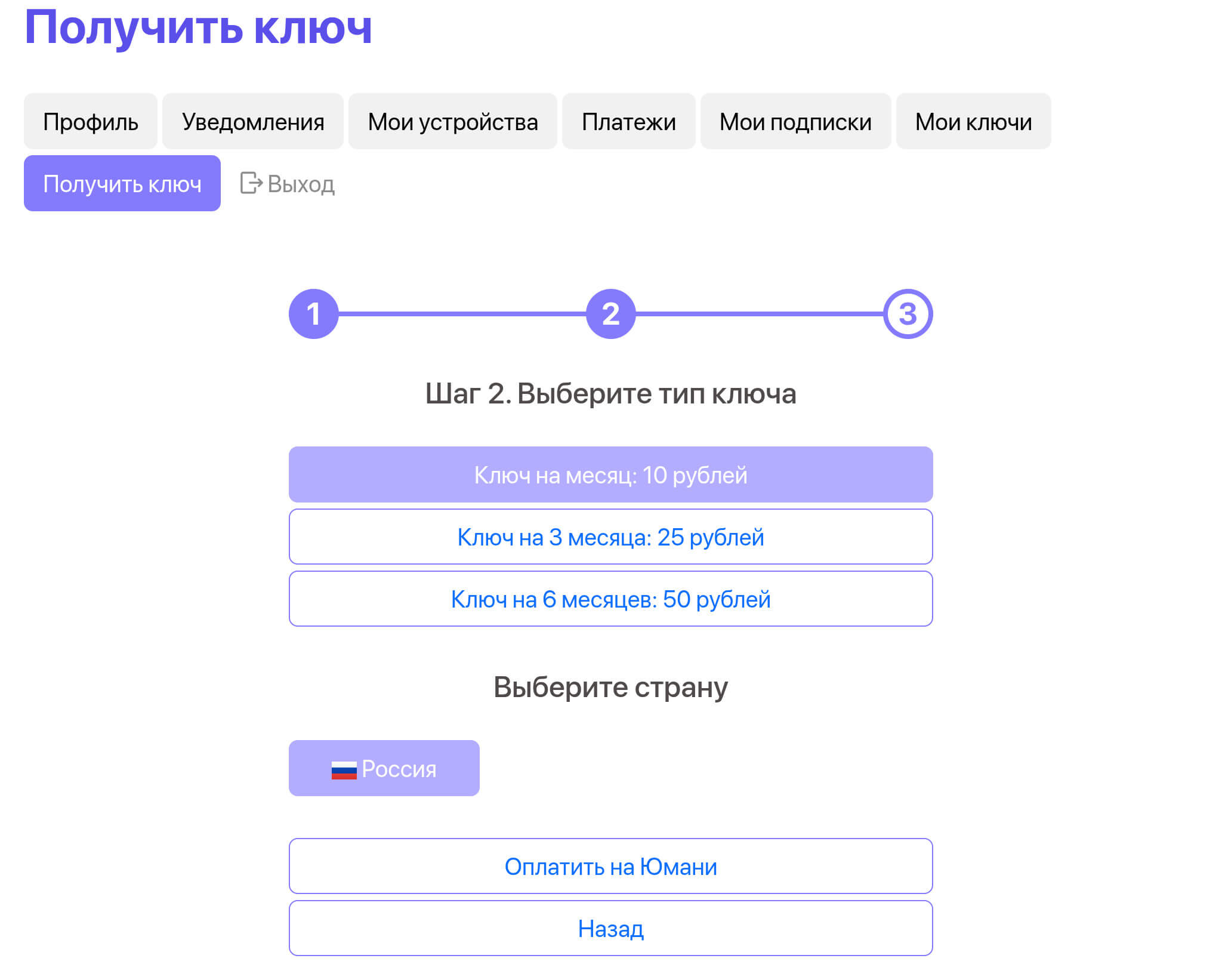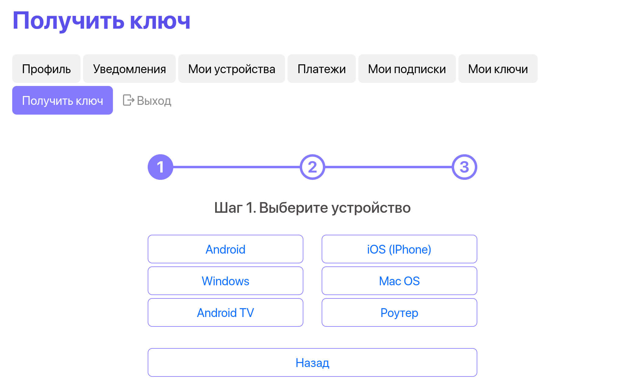 2. После авторизации необходимо перейти во вкладку “Получить ключ” и выбрать желаемое устройство: