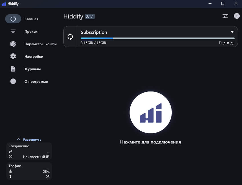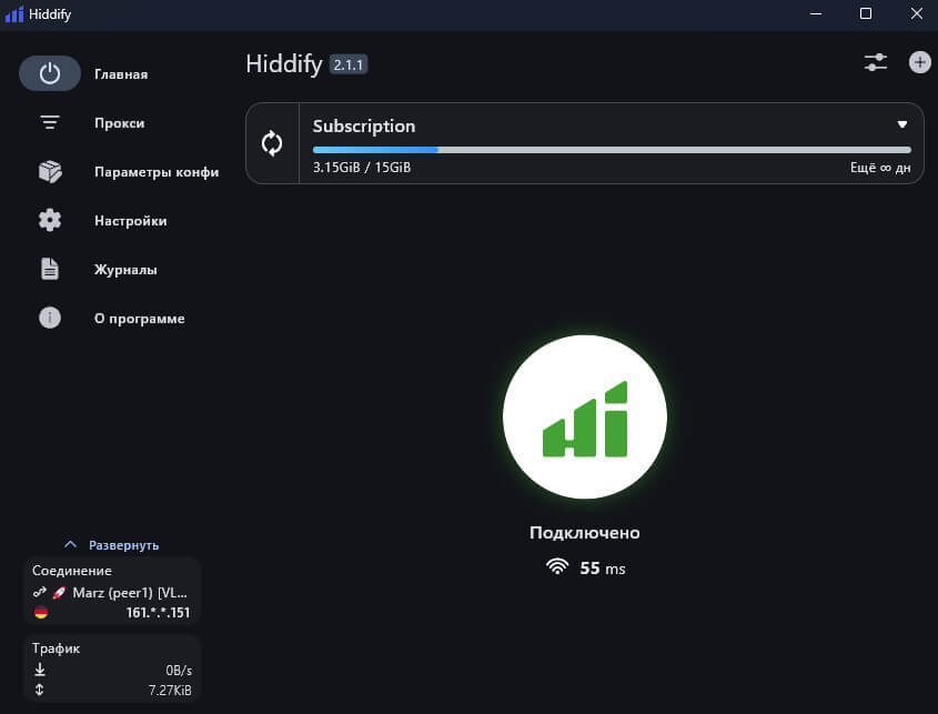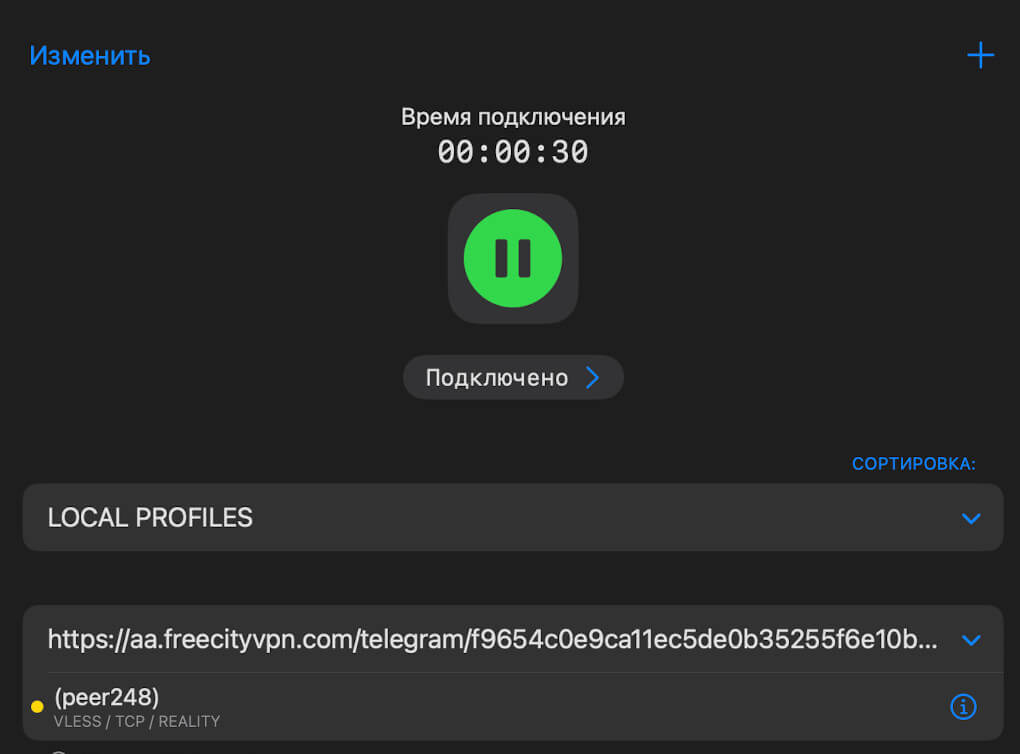 7. После добавления ключа необходимо нажать на кнопку “Пуск” посередине экрана и ВПН запустится: